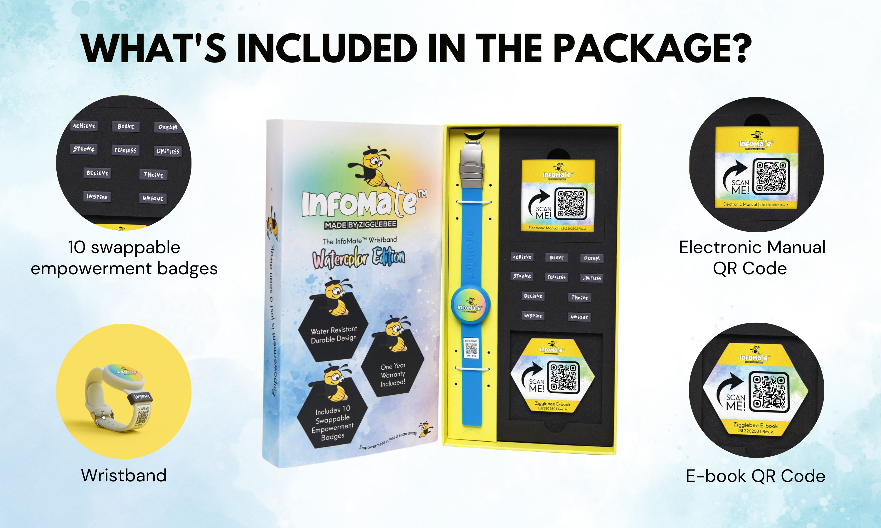 The InfoMate™ Wristband includes an interactive e-book for children.