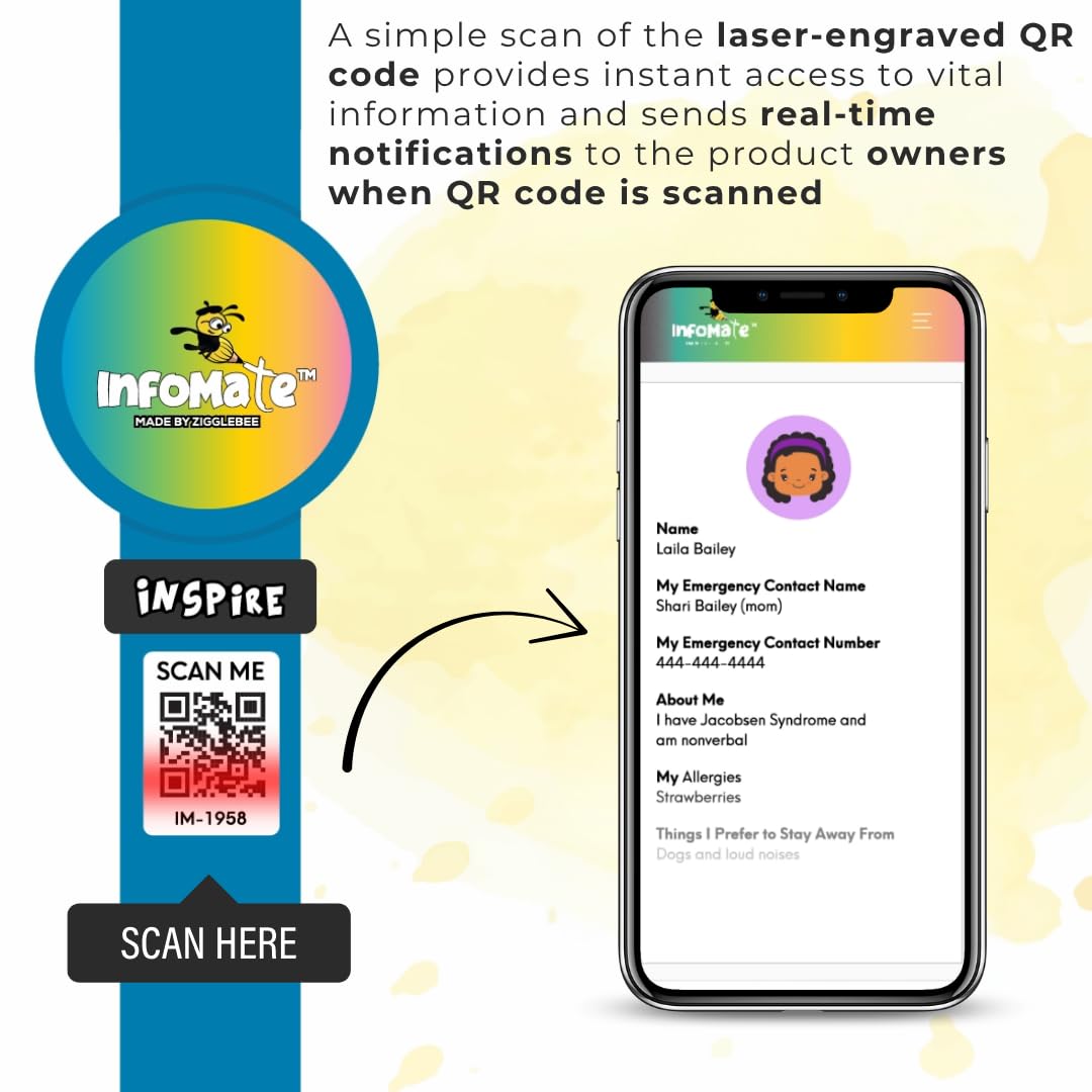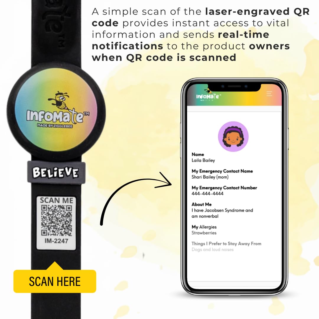 - FDA-Registered Facility & Smart Alert System – Produced in an FDA-registered facility, each InfoMate wristband links to patent-pending software that can notify registered contacts when the QR code is scanned and supports real-time updates to emergency details—no distance limitations.